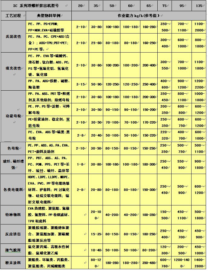 ZC系列同向平行雙螺桿擠出機(jī)典型物料作業(yè)能力一覽表(參考值)